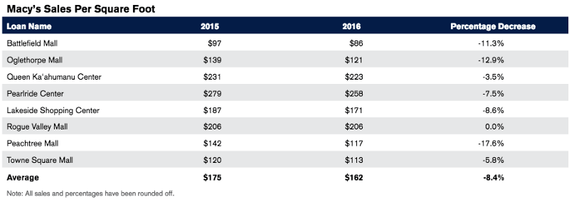 Analysts at DBRS have noticed declining sales in loans secured by department-store-anchored malls across North America, particularly ones with Macy’s. Analysts reported that Macy’s sales are below the chain’s national sales average in locations like Battlefield Mall (Springfield, Missouri); Gurnee Mills (Gurnee, Illinois); and Lakeside Shopping Center (New Orleans, Louisiana). The decline is well evidenced in the year-end revenue based on yearly sales per square foot reported by eight malls in DBRS-rated transactions (see table below).