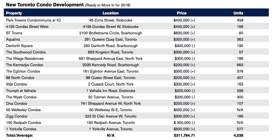 Per the following table, which shows new non-luxury condo developments across the Great Toronto Area (GTA), the average starting price for condos is calculated to be approximately $312,500. Bidding wars hike this price up further, as more people compete for property ownership in the downtown core. This hefty price tag puts home ownership starkly out of reach for most first-time home buyers looking to own property within the City of Toronto, as explained further below.