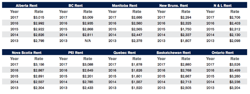 Rental rates have been steadily increasing over the years, according to the Canadian Mortgage and Housing Corporation. Across all provinces, the monthly rent rate was above $1,000 in the 2010’s (refer to the provincial chart set below) for standard unit spaces. As of 2017, Ontario displayed the highest rent rate at $3,526/month, while Québec had the lowest rate at $1,678/month. Between 2013 and 2017, the national average rental rate increase was 4.7% year over year. Assuming this percentage increase persists, national average rent rates could reach just over $4,000 a month by 2025. Keeping up with this rate will become increasingly difficult, especially for those on a fixed income.