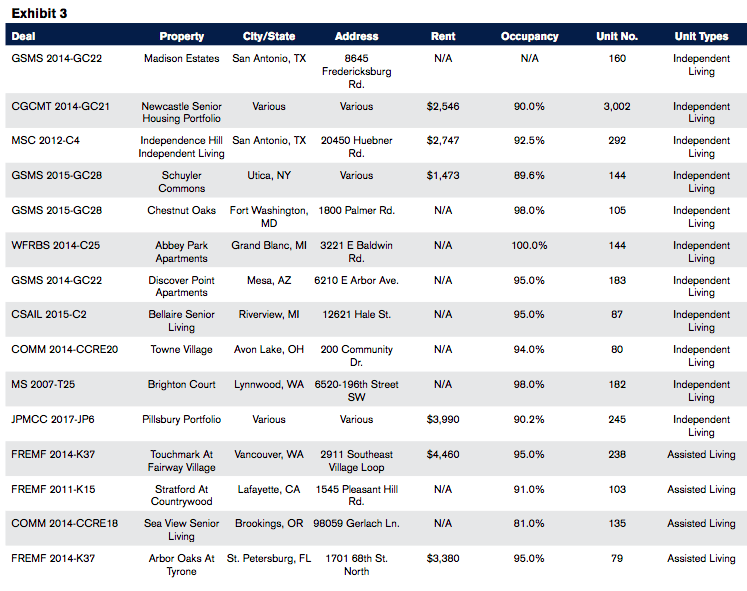 DBRS inspected over 20 independent and assisted living properties across the United States (refer to Exhibit 3) and found that high occupancy rates and rent rates are correlated across deals. On average, properties exhibited an average unit count of 113 with an average occupancy of a staggering 92.2%, which leaves little room for new admissions. The high demand resulted in other issues like high rent rates, with an average monthly cost of $3,143 ($2,689/month for independent living units and $3,749/month for assisted living units). The average monthly costs of the rated properties are in line with the national average of $3,293. Assisted living communities tend to be more expensive than independent living communities because they include trained staff and luxurious amenities such as a pool, fitness center, coffee shop, beauty salon, library, meal services, etc.
