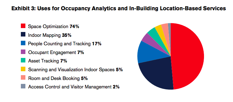 In addition to reducing costs, hotels are using software to improve the guest experience, allowing room access and climate control with smartphones. The hospitality industry is expected to spend over $500.0 million on connected software equipment and over $2.2 billion in guest-room renovations to accommodate these changes, according to IHS Markit Ltd. Commercial property owners and managers are also using new technologies to manage space more efficiently. Memoori found that, when it came to smart building analytics and location-based services within a building, software was most often used to optimize space (refer to Exhibit 3) to increase revenue and make the most of rental costs per sf. Other uses include indoor mapping as well as people counting and tracking for occupancy purposes.