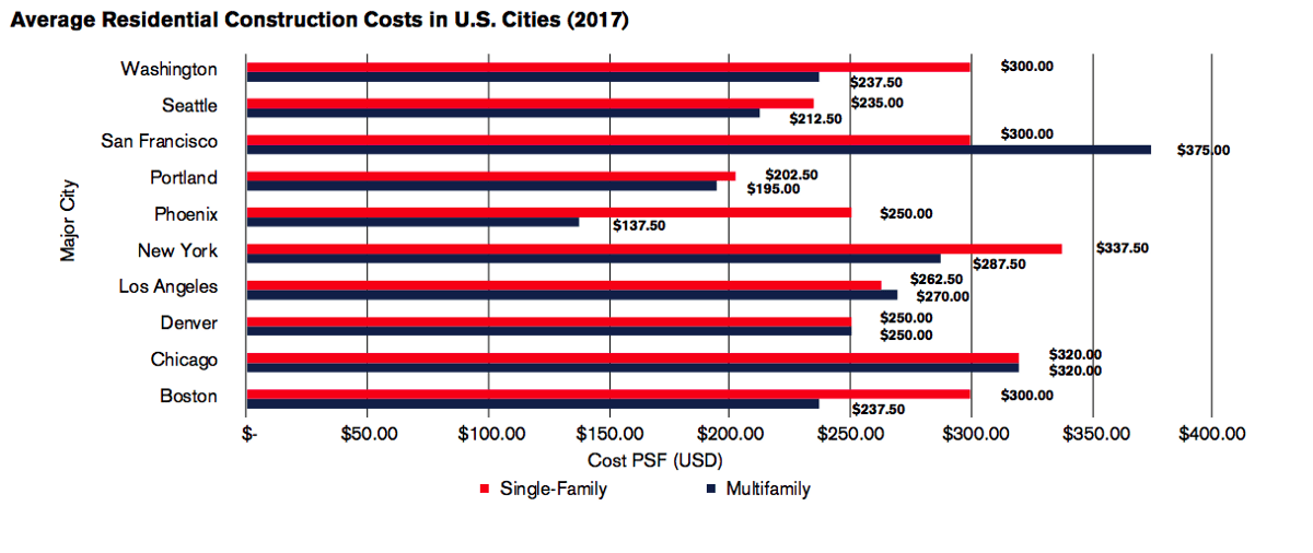 Commercial real estate development is an expensive undertaking. The average cost is approximately $267.44 per square foot (psf ) across all property types in all major U.S. cities (figure sourced from calculating the average construction costs psf in office, hotel, retail and residential properties across all major U.S. cities in data collected from market data analyst source Statista). But this cost varies widely across the United States: At one end is the most expensive property type to construct — the hospitality property — particularly the five-star hotel ($413.64 psf average across major cities). At the other end is the least expensive — the retail strip mall property type ($167.50 psf average across major cities). Refer to the appendix for a comprehensive assessment on average construction costs across U.S. cities and property types.