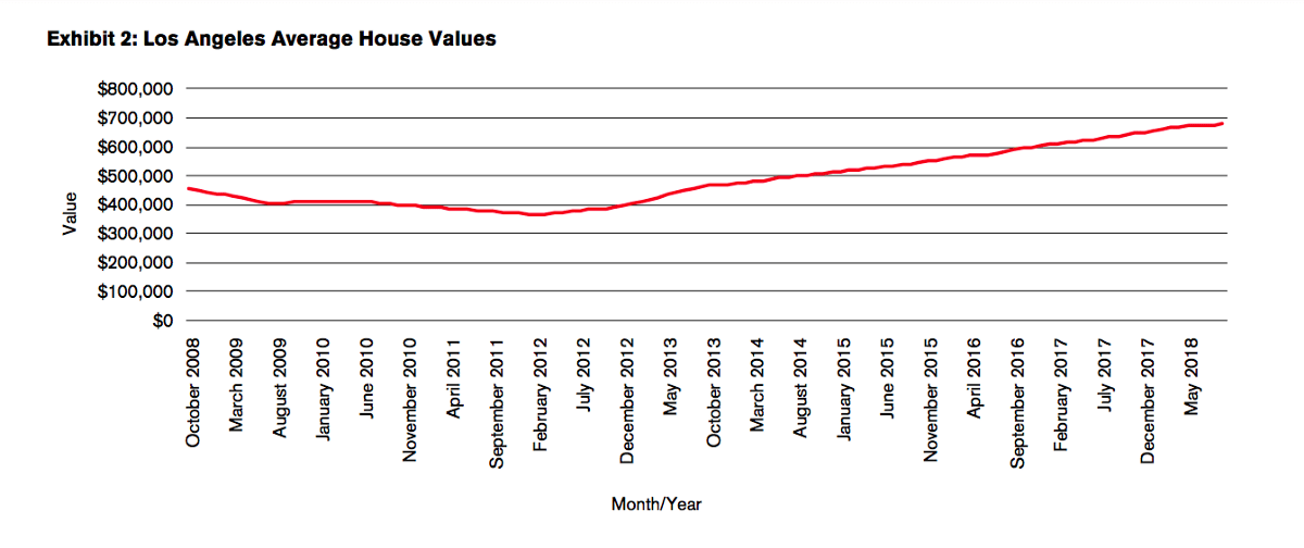 The latest reported average rent in Los Angeles from Zillow’s listings is $2,979 as of September 2018. Average rent rates across Los Angeles have remained steady, with the most prominent increase beginning in 2014 (refer to Exhibit 1). The average rent rate increase since November 2010 is about 31.2%. The change from August 2017 to August 2018 is about 2.0%, and the average year-over-year (YOY) rent increase is about 0.2%. Average house values have also been steadily increasing since the recession (refer to Exhibit 2) and currently stand at $679,200, according to Zillow’s Home Value Index. These values are expected to increase by 5.8% YOY by the Index’s estimates. According to the CBRE’s Los Angeles Multifamily MarketView Figures Q2 2018 report, there were 32,611 units under construction at the beginning of 2018, which is 12.2% higher than the previous year. Furthermore, the units under construction would increase the market supply by 3.3%. The report predicts that despite the higher costs of construction occurring nationwide, development is expected to be relatively high throughout 2019 and 2020. The supply completion level is at a record high, though rent stabilization may challenge these high levels of construction moving forward, as investors and landlords may view apartments as less profitable assets.