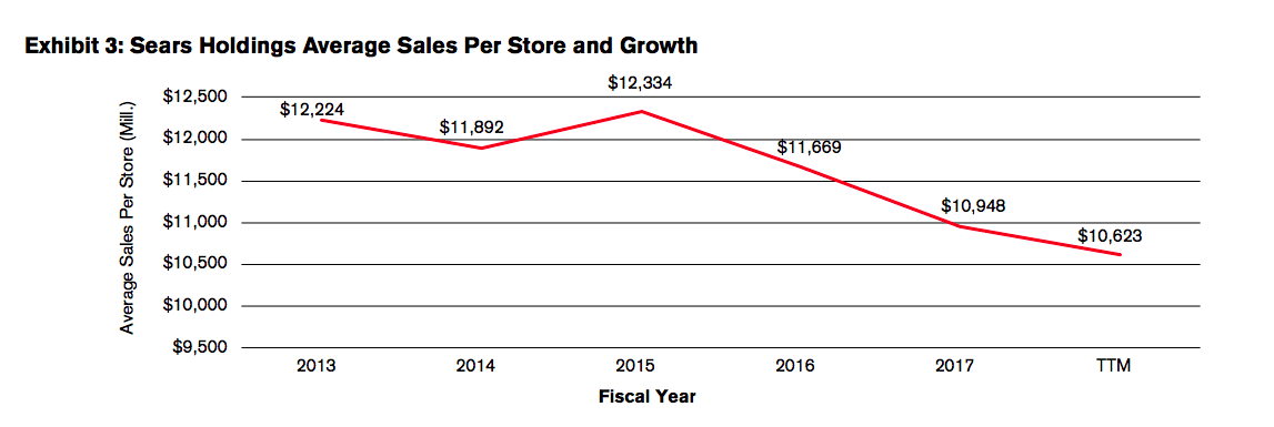 Sales for the vacating tenants were available for ten of these properties with reported sales generally below the company averages of approximately $101 per sf (psf ) for Kmart and $87 psf for Sears in 2017. In-line sales for these stores were generally healthy, averaging $384 psf across the 13 properties reporting. These trends suggest the low sales for Sears and Kmart at these properties were largely a factor of the retailers’ diminished appeal within the market, and suggestive of opportunity for the respective operators to backfill the empty space with a more desirable retailer or entertainment option. The declining favor with American shoppers is evident in overall sales trends for the company, which have fallen precipitously over the last few years as shown in Exhibit 3.