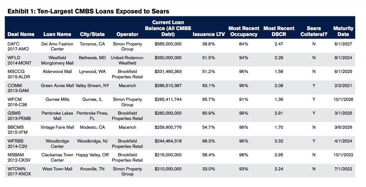 Based on the DBRS Viewpoint database, there are approximately 220 properties in the United States that secure 282 non-portfolio CMBS loans and loan pieces with exposure to Sears and Kmart, either as a collateral tenant or a non-collateral shadow anchor within a regional mall or shopping center. This list includes a handful of properties exposed to Sears Outlet or Sears Hometown stores, which are owned by a separate entity that is not included in Sears’ bankruptcy filing; to date, no store closures for those divisions have been announced. Also, in some cases, the Sears or Kmart location at the properties backing these loans has already been closed or announced for closure in the near term. The largest ten CMBS loans exposed to Sears are listed in Exhibit 1 below.