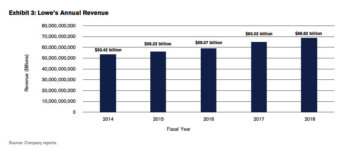 Leading up to the announcement, Lowe’s financials had increased steadily year-over-year and reported an annual EBITDA of $8.0 billion in 2018 (+9.6% five-year CAGR). While this growth is solid, sales growth at its largest competitor — The Home Depot — has been even more robust, with reported 2018 EBITDA of $16.5 billion in 2018 (+12.1% five-year CAGR). Strategically closing underperforming properties, doubling down on nearby locations and capitalizing on its e-commerce model may help Lowe’s begin to narrow the gap in financial performance metrics with industry bellwether The Home Depot. This tactic tends to be routine when leadership changes hands and finds room for improvement.
