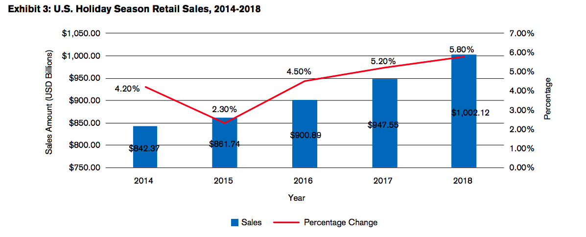 With a stronger economy and lower unemployment rate in the United States, more Americans are getting into the holiday spirit this year. According to the National Retail Federation’s (NRF) 2018 Holiday Spending Survey, consumers plan to spend about $506 on gifts for family in 2018, up from $478 in 2017. Shoppers also reported that they would likely spend approximately $75 on friends, $31 on co-workers and $31 on other gifts this year, all of which exceed or remain consistent with spending patterns in previous years (see Exhibit 1). The NRF’s main takeaway is that consumers plan to spend 4.1% more in the 2018 holiday season than in 2017.